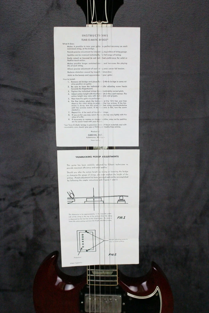 Summary: It is widely agreed that 1964 is the year the SG came into its own, dropping the Les Paul moniker in 1963 while increasing the thickness of the neck profile and replacing the side pull vibrato with the more reliable Maestro Vibrola in ’64. This Gibson SG boasts the original “Patent Number” humbuckers and the original bridge and Maestro Vibrola. The neck angle is nearly perfect for an SG during this time period, allowing for the lowering and raising of the bridge as needed. This SG is all original and is in great condition for a vintage istrument from the early 1960’s.