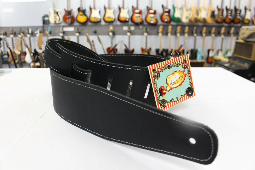 This is a Henry Heller guitar strap. It is black leather with black stitching and the Empire Guitars logo.