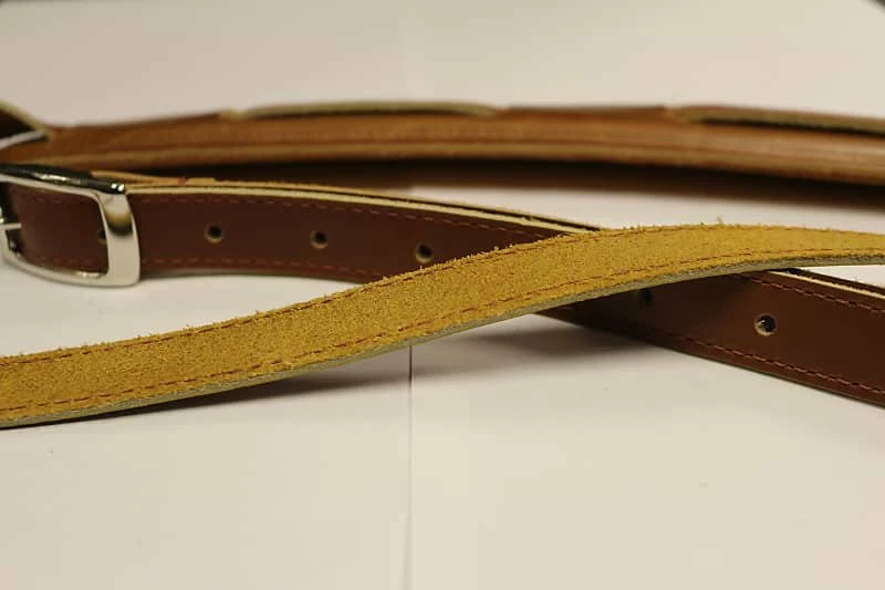 This strap is called the “Souldier Plain Saddle Strap – SSD0000TN02TN” – this one is a tan leather guitar strap with a tan leather pad…